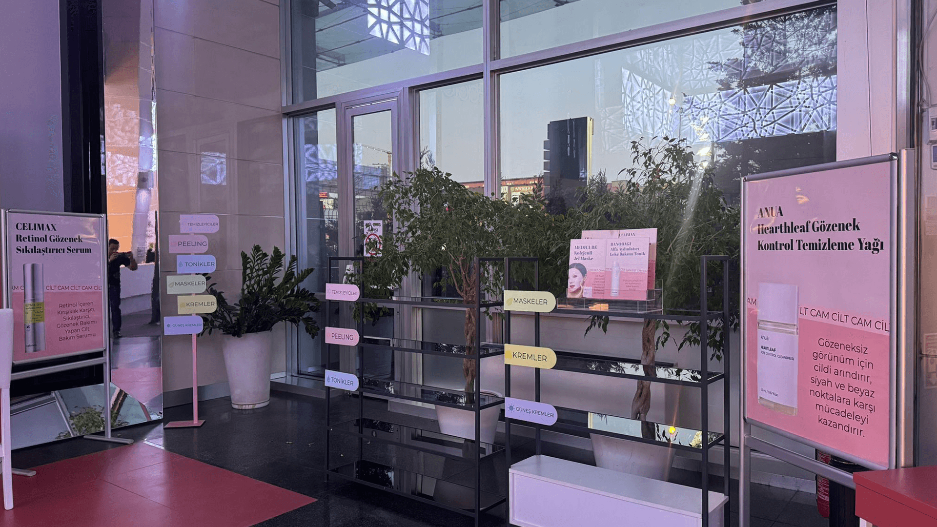 Makyaj deneyim alanları; hem estetik hem de fonksiyonel bir kurgu ile planlandı. Ürün teşhir üniteleri, uygulama istasyonları ve aynalı deneyim noktaları sayesinde ziyaretçiler ürünleri profesyonel destekle deneyimleyebildi. Alan tasarımı, sosyal paylaşıma uygun görsel çekim noktalarıyla da desteklenerek etkinliğin dijital görünürlüğünü artırdı.