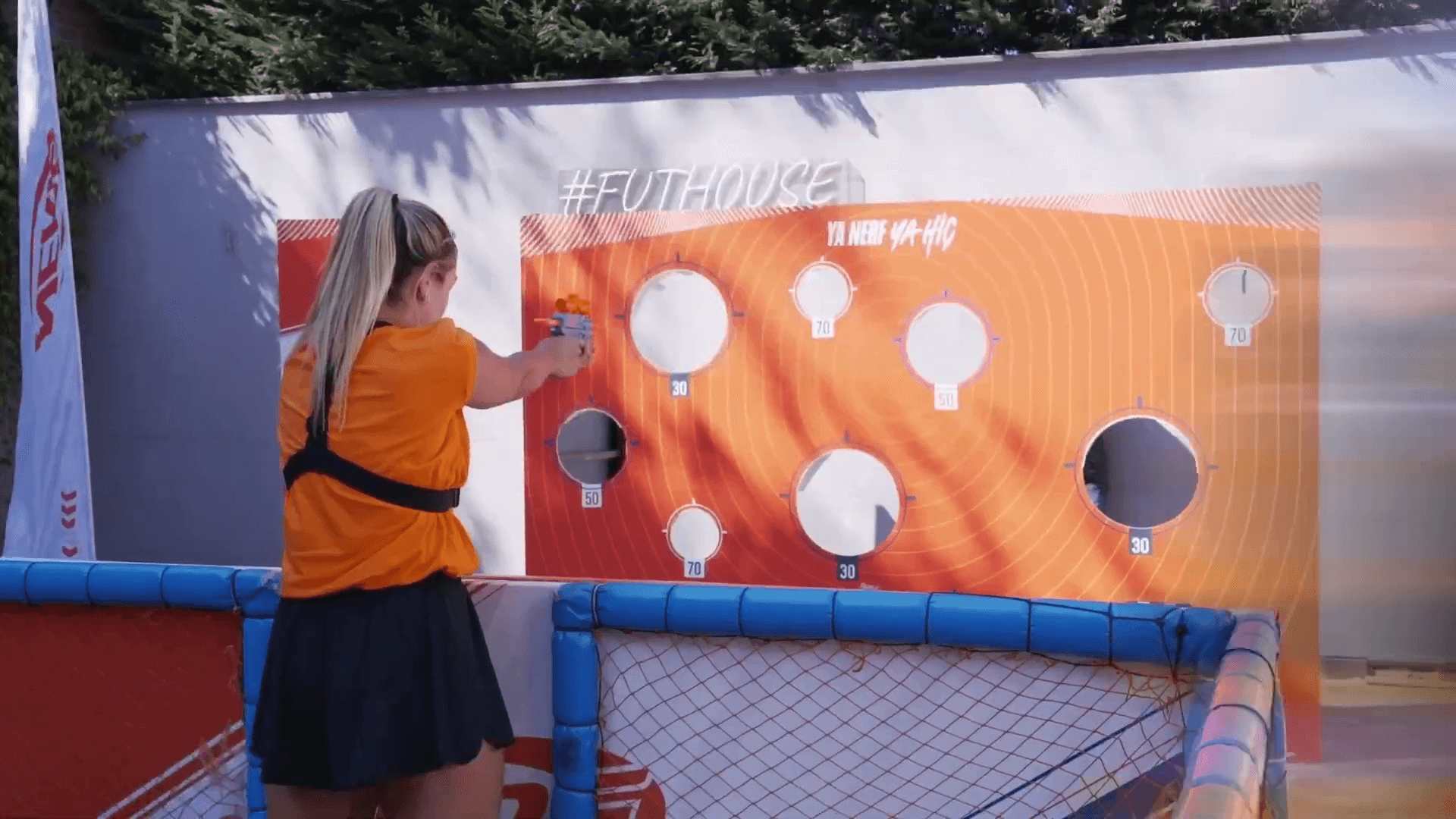 Fut House’un dinamik saha yapısı, NERF parkurlarıyla entegre edilerek çok katmanlı bir oyun alanına dönüştürüldü. Hedef vurma istasyonları, takım bazlı mücadele alanları ve zamana karşı yarış formatlarıyla gün boyu süren rekabetçi bir turnuva atmosferi yaratıldı. Bu yapı, hem bireysel beceriyi hem de takım koordinasyonunu öne çıkaran bir deneyim sundu.
